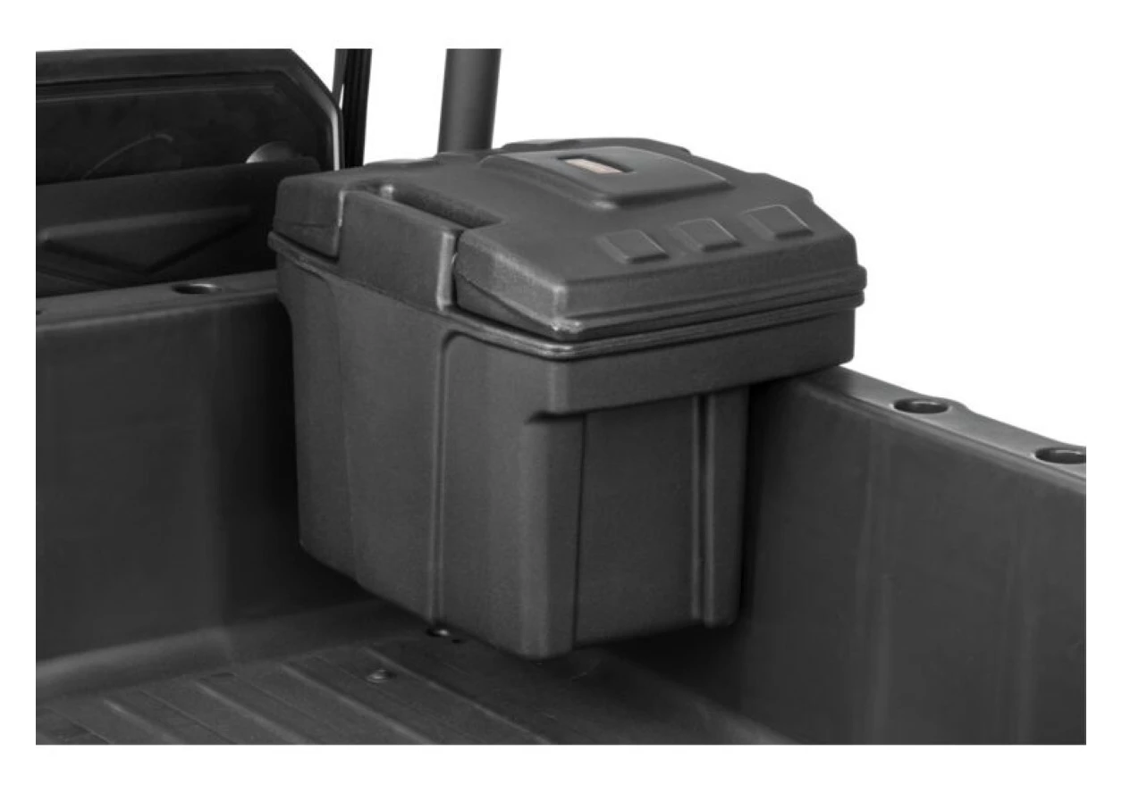 The Quad Boss Bed Box allows you to organize and secure supplies inside or even outside the perimeter of your UTV’s bed. Quick-mount pegs allow for easy installation and removal to create multiple configurations. When mounted on the outside of your UTV’s bed sides, the unit adds to overall capacity. The box is constructed from rotomolded polyethylene in a textured black finish. The heavy-duty lid is double-walled for extra durability and features a lockable latch. No tools or extra mounting hardware is needed, and the bed box is made in the USA.