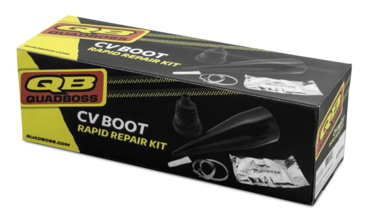 QuadBoss Rapid Repair CV Boot Kits are a universal repair kit for quick, trailside fixes to torn, leaky CV boots. Kits include one, specially designed CV boot that is engineered to slide and stretch over most axles and CV boots. With a QuadBoss CV Boot Kit in place, you greatly increase your chances of getting through your ride and back to base with CV joints healthy, intact and protected from dirt and debris. Store a Rapid Repair Boot Kit or two in your toolbox for safe keeping.Â