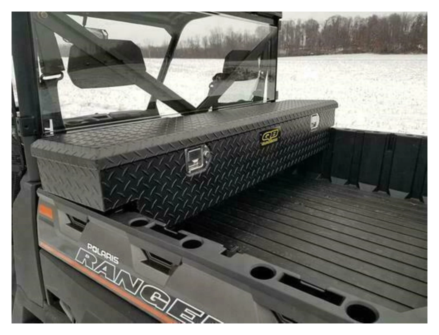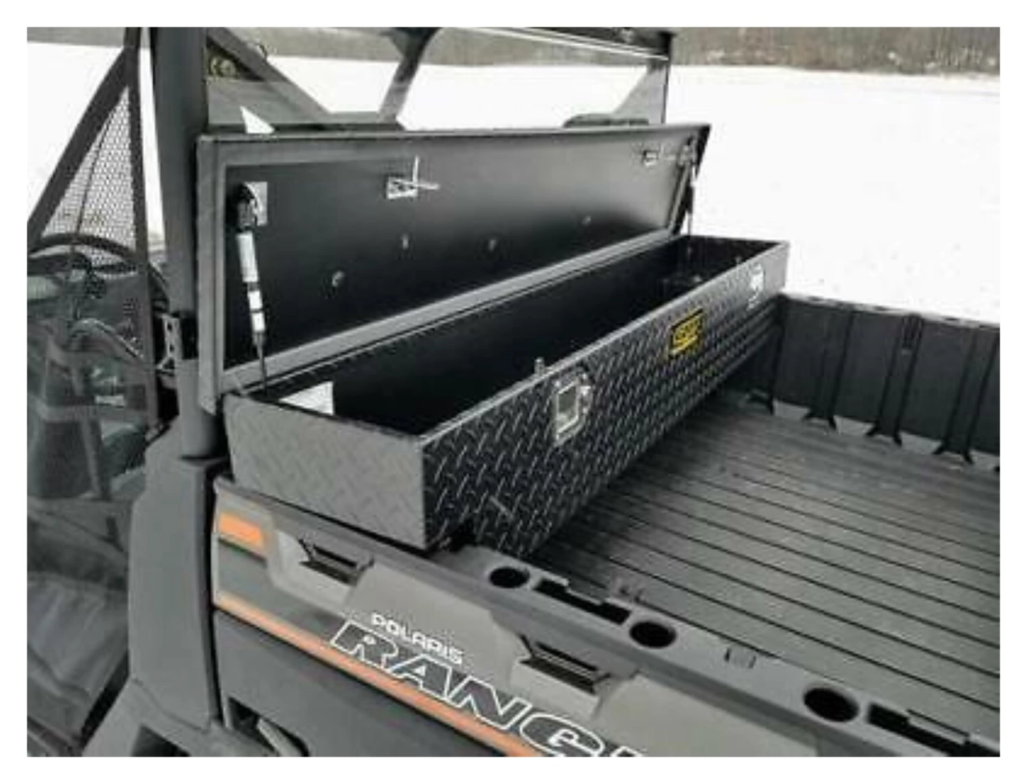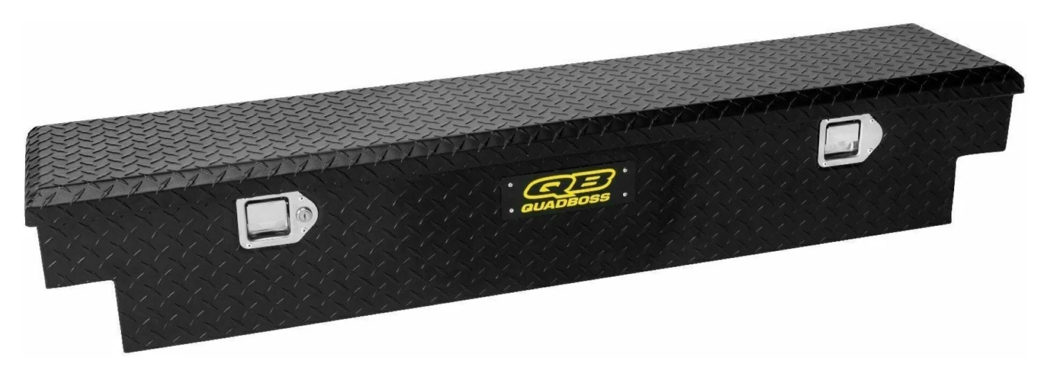 For job site good looks and right-angle functionality, go no further than the Quad Boss ATV Utility Rear Box. Durable aluminum diamond plate construction looks big rig fresh. Designed to take a beating, the aluminum one-piece tub and lid are designed to support heavy loads, absorb tool drops and prevent leakage. The patented foam-filled lid creates a solid structure to prevent bending or warping and ensures easy opening and closing. Micro seal stripping keeps out moisture, dust, and grime.